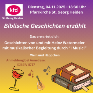 Am Dienstag, den 04. November 2025, um 18.30 Uhr, lädt die kfd Heiden herzlich in die Pfarrkirche St. Georg ein: Biblische Geschichten erzählt von und mit Heinz Watermeier (ehemals Pastoralreferent in unserer Kirchengemeinde) mit musikalischer Begleitung durch „I Musici“. In der Pause wird ein Getränk gereicht. Dauer der Veranstaltung: 18.30 Uhr bis 20.15 Uhr. Telefonische Anmeldung bei Anneliese Schäpers unter: 0 28 67-87 57.