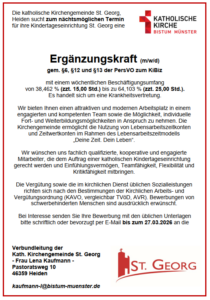 Die katholische Kirchengemeinde St. Georg, Heiden sucht zum nächtsmöglichen Termin für ihre Kindertageseinrichtung St. Georg eine